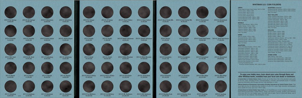 The Whitman U.S. Washington National Park Quarter Coin Folder 2010-2015 #2876 is a reliable and attractive way to collect and organize your America the Beautiful quarters. Perfect for beginners or experienced numismatists, it provides secure storage and valuable reference details. Coins not included.