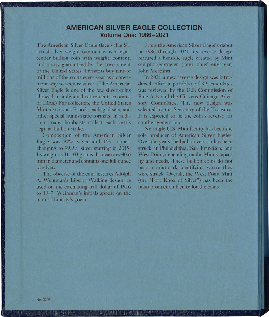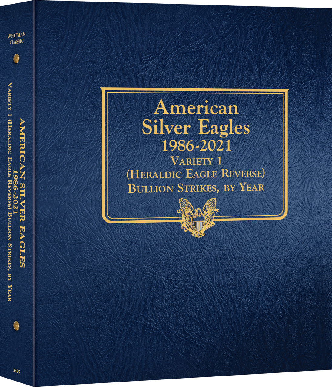 A distinguished Whitman Classic® album designed to showcase the iconic American Silver Eagle series, honoring the artistry and legacy of the nation’s official silver bullion coin. Crafted with Whitman’s signature grained leatherette cover in classic blue, this album offers both elegance and enduring protection.