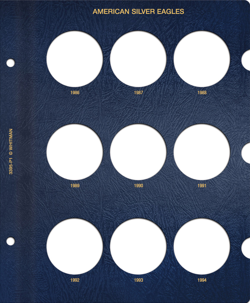 A must-have for collectors of America’s beloved Silver Eagle series, this Whitman Classic® album provides a timeless way to organize and display your collection. Holds up to 6 total pages. No coins included.