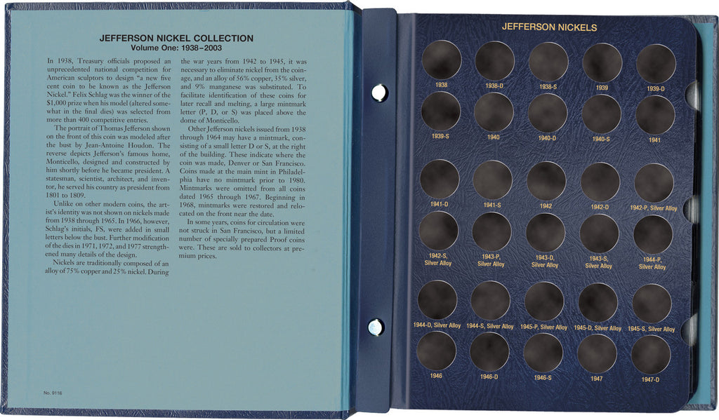 A distinguished Whitman Classic® album designed to showcase the complete Jefferson Nickel series from its debut in 1938 through 2003. Features Whitman’s signature grained leatherette cover in classic blue for a refined and durable finish.