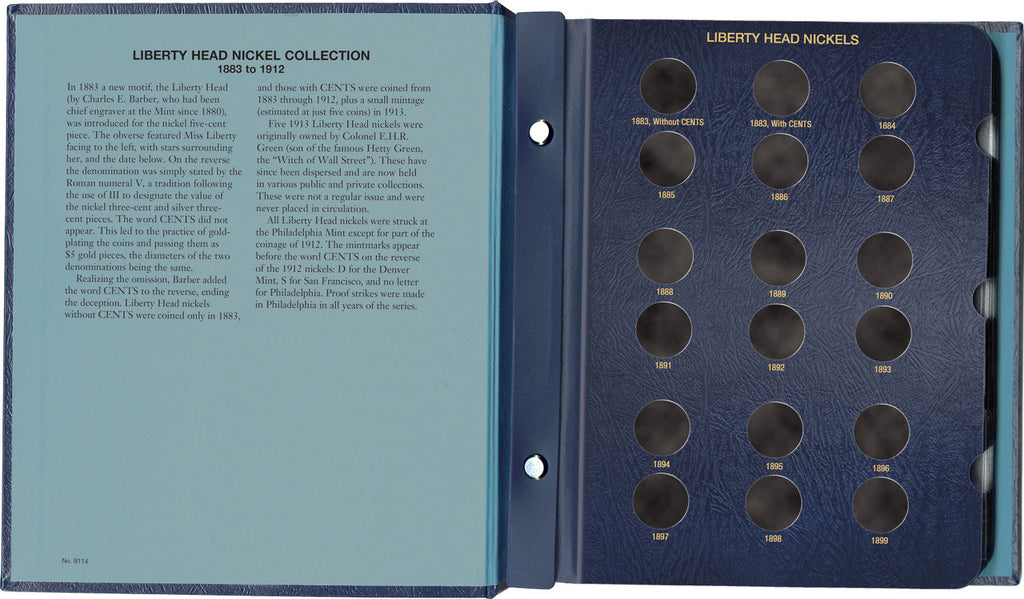 A distinguished Whitman Classic® album designed for collectors of the Liberty “V” Nickel series, featuring Whitman’s signature blue grained leatherette cover and sturdy, soil-resistant construction.