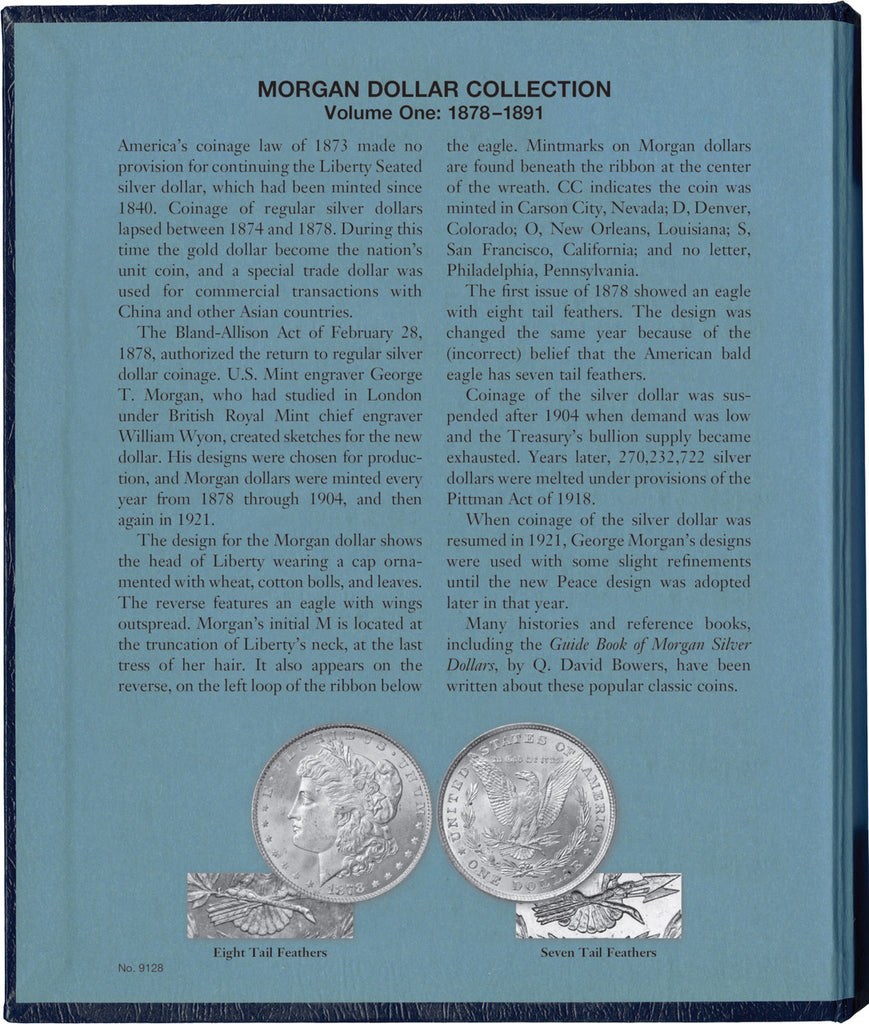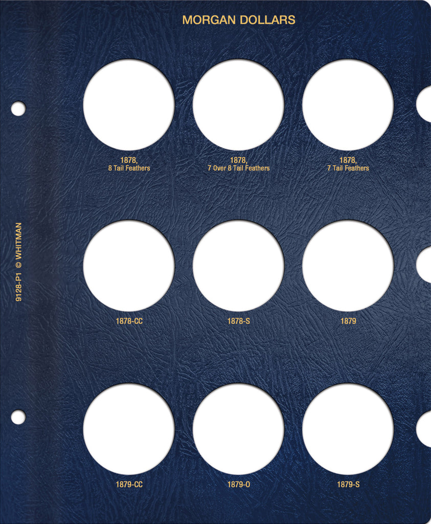 The Whitman Classic® Morgan Dollar Album (1878–1891) offers a distinguished and durable way to preserve one of America’s most iconic silver series. With Whitman’s signature blue grained leatherette cover and sturdy, soil-resistant construction, this album ensures both protection and elegance. Each page includes labeled openings, mintage data, and historical details—making it the trusted choice for collectors who take pride in their presentation.