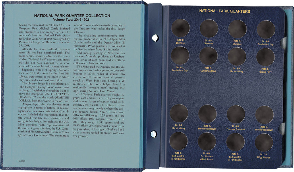 A premium Whitman Classic® album designed to beautifully display the final years of the National Park Quarter Program. Crafted with Whitman’s signature grained leatherette cover in classic blue for a timeless and durable presentation.