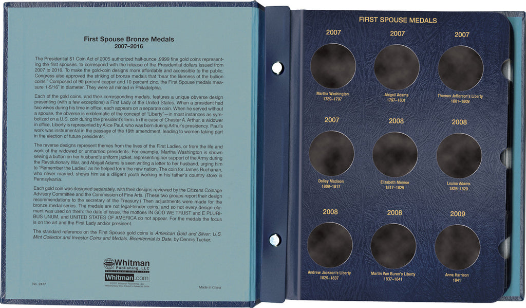 This Whitman Classic® album provides a refined and durable way to showcase the complete Presidential First Spouse Medal series — the trusted choice for collectors of U.S. Mint bronze issues.