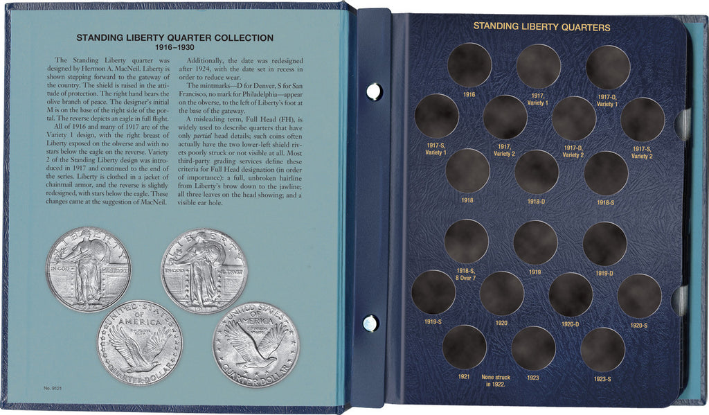 A distinguished Whitman Classic® album crafted to showcase the beauty and history of the Standing Liberty Quarter series. Designed with Whitman’s signature grained leatherette cover in classic blue, it combines timeless style with archival-quality protection.