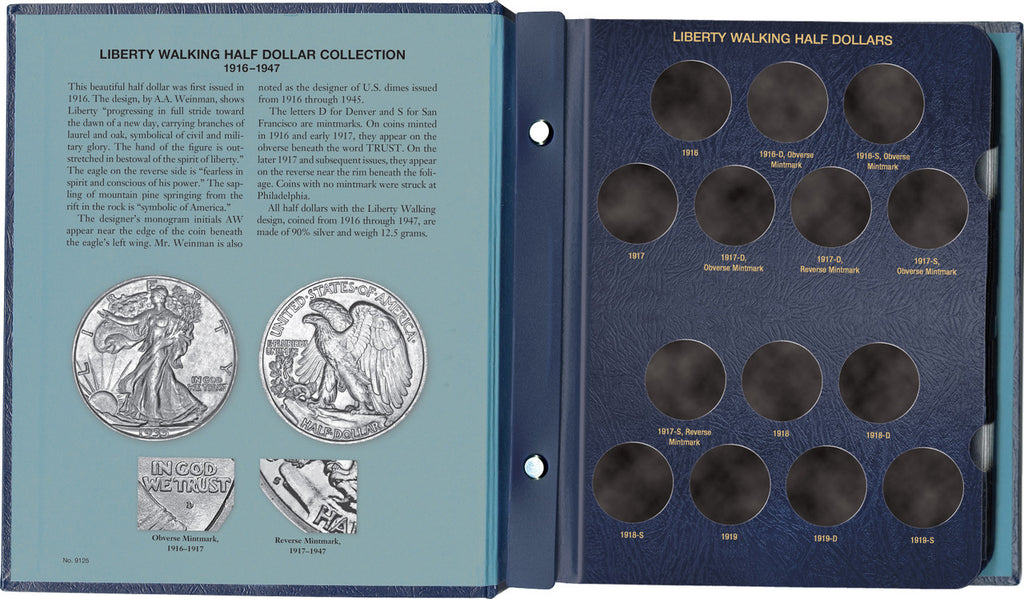 Includes labeled openings for easy organization and identification of Walking Liberty Half Dollars by year and mint.